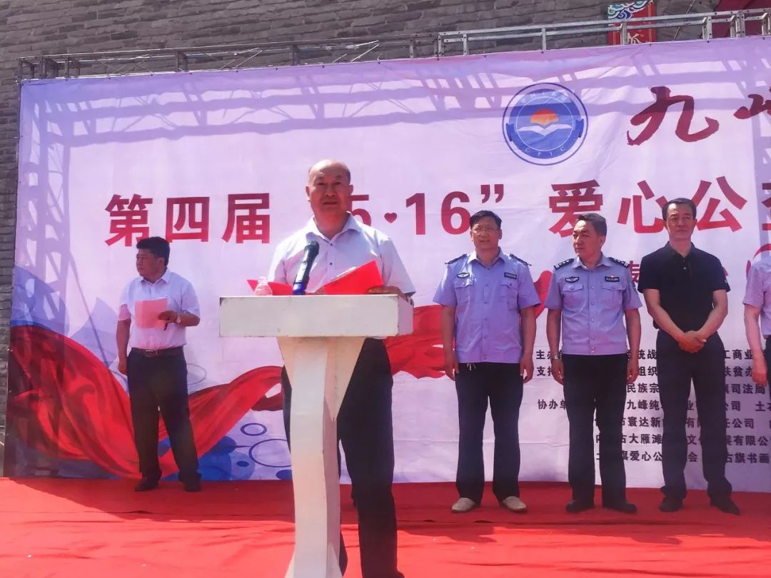 5月16日上午,土右旗工商联(总商会)在磐安门广场隆重举行第四届“5?16爱心公益日”暨扶贫宣传系列活动。包头市工商联党组成员、副调研员、总商会副会长刘晓迁,市工商联党组成员、秘书长梁保钢,旗委常委、统战部部长伏俊奎,旗人大常委会副主任黄巧荣,旗政协副主席赵光出席启动仪式,旗民宗局、卫计局、司法局等11个部门与内蒙古九峰纯粮有限公司等87个商家参加了活动。