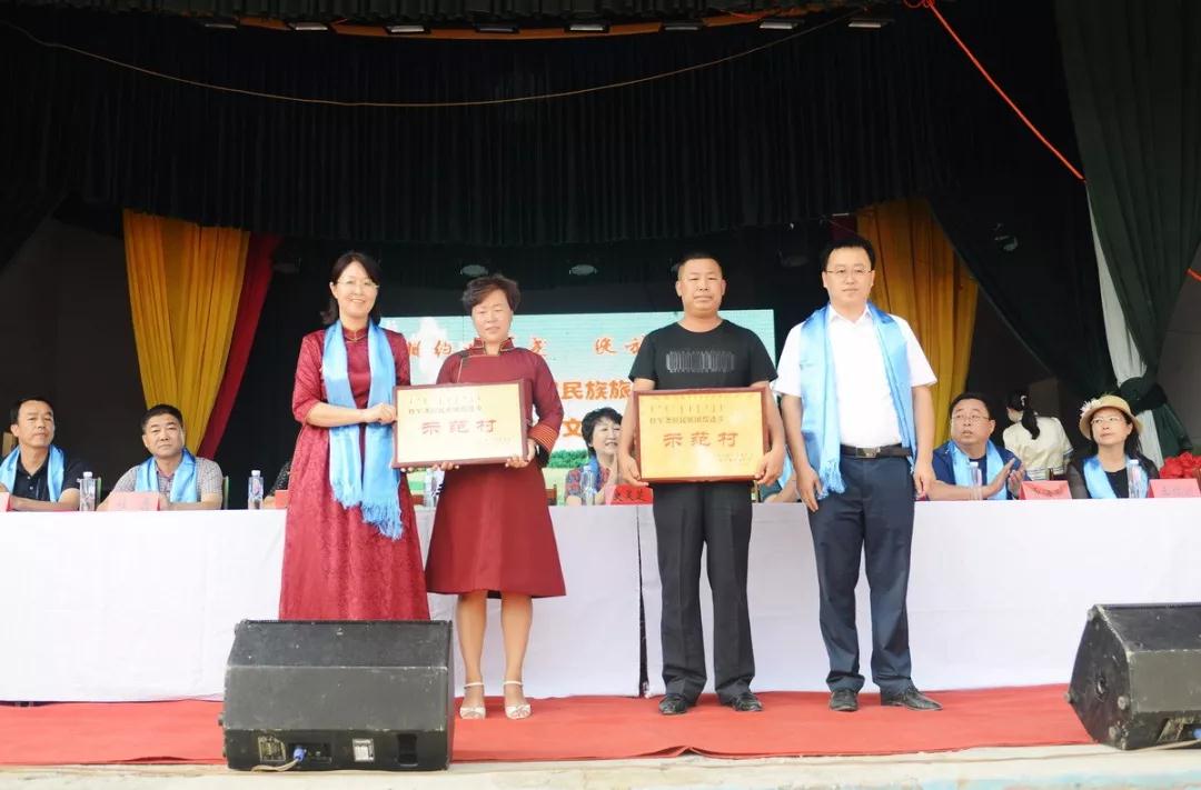 将军尧镇党委书记伏凌慧 、镇长阮兴俊为将军尧镇民族团结进步示范村进行颁奖